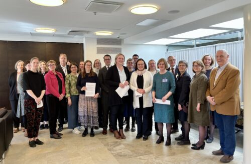 Kannanoton luovutustilaisuus eduskuntaryhmien edustajille 21.4. Mukana eduskuntaryhmien edustajia ja kannanottoa laatineita järjestöjä sekä vanhusasiavaltuutetun toimiston väkeä.